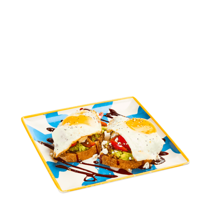 smashed avocado on wheatberry bread topped with grape tomatoes, two sunny side up eggs and everything seasoning