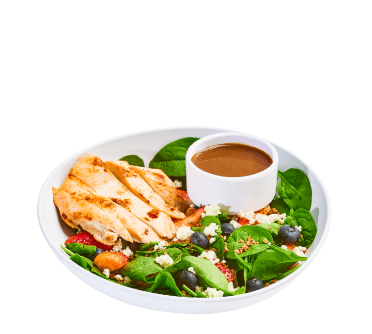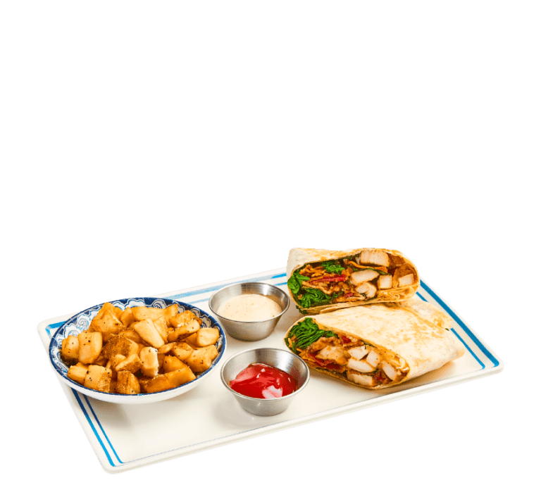 bowl of home fries or cheesy grits topped with sauteed spinach and mushrooms, caramelized onions, roasted tomatoes, goat cheese, poblano-tomato sauce. Pile on the extras by adding protein, an egg, or avocado!