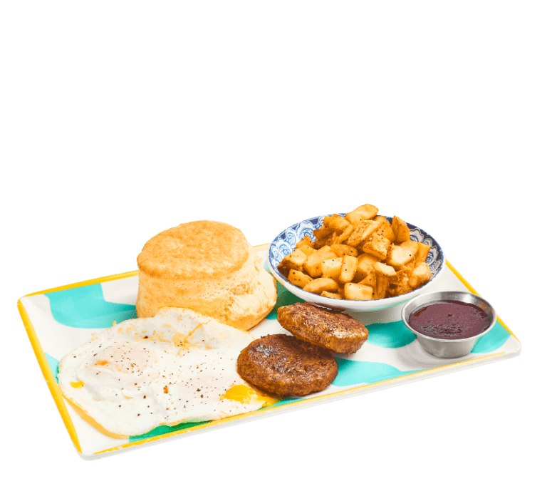 Biscuit, sausage, 2 eggs your way, fruit or hash brown, jam & butter