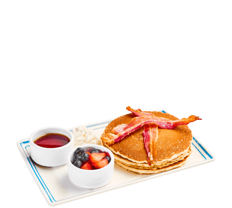 With whipped cream, maple, berries and two pieces of bacon (make 'em blueberry or bacon pancakes +2)